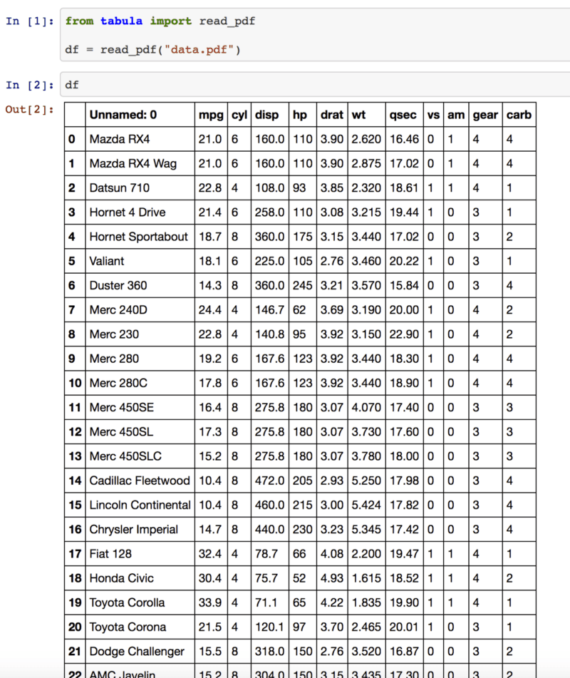 tabula is a tool to extract tables from PDFs. It is GUI based software, but tabula-java is a tool based on CUI. Though there were Ruby, R, and Node.js bindings of tabula-java, before tabula-py there isn’t any Python binding of it. I believe PyData is a great ecosystem for data analysis and that’s why I created tabula-py. If you are familiar with R, I highly recommend to use tabulizer, which has the most richest bindings including rich GUI.