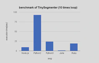 先日、工藤さんがJavaScript向けに作った日本語のコンパクトな分かち書きツール、TinySegmenterをJuliaに移植したTinySegmenter.jlを作りました。 もともとは、PyconJPでjanomeの話を聞いたら居ても立っても居られなくなって、簡単なTinySegmenterを移植したんですが、そしたら思いもよらぬ展開が待っていました。
