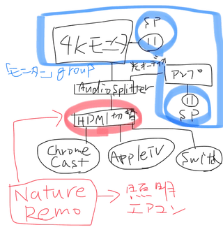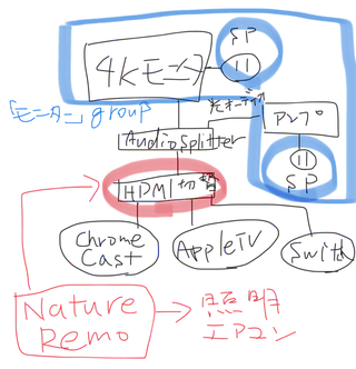 HDMI切替機には、Chromecast UltraとAppleTV、PC、Nintendo Switchなどが付いています。これをNature Remoで切り替えます。この切替はIFTTTを使い、Google AssistantとNature Remoを使い連携をするというごく普通の構成で行なっています。
